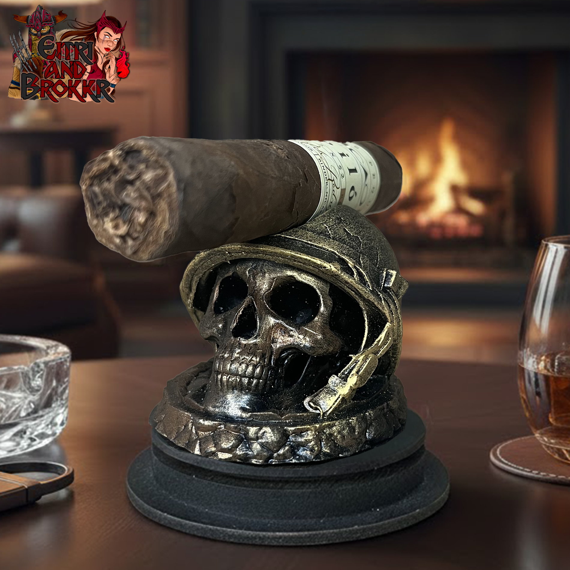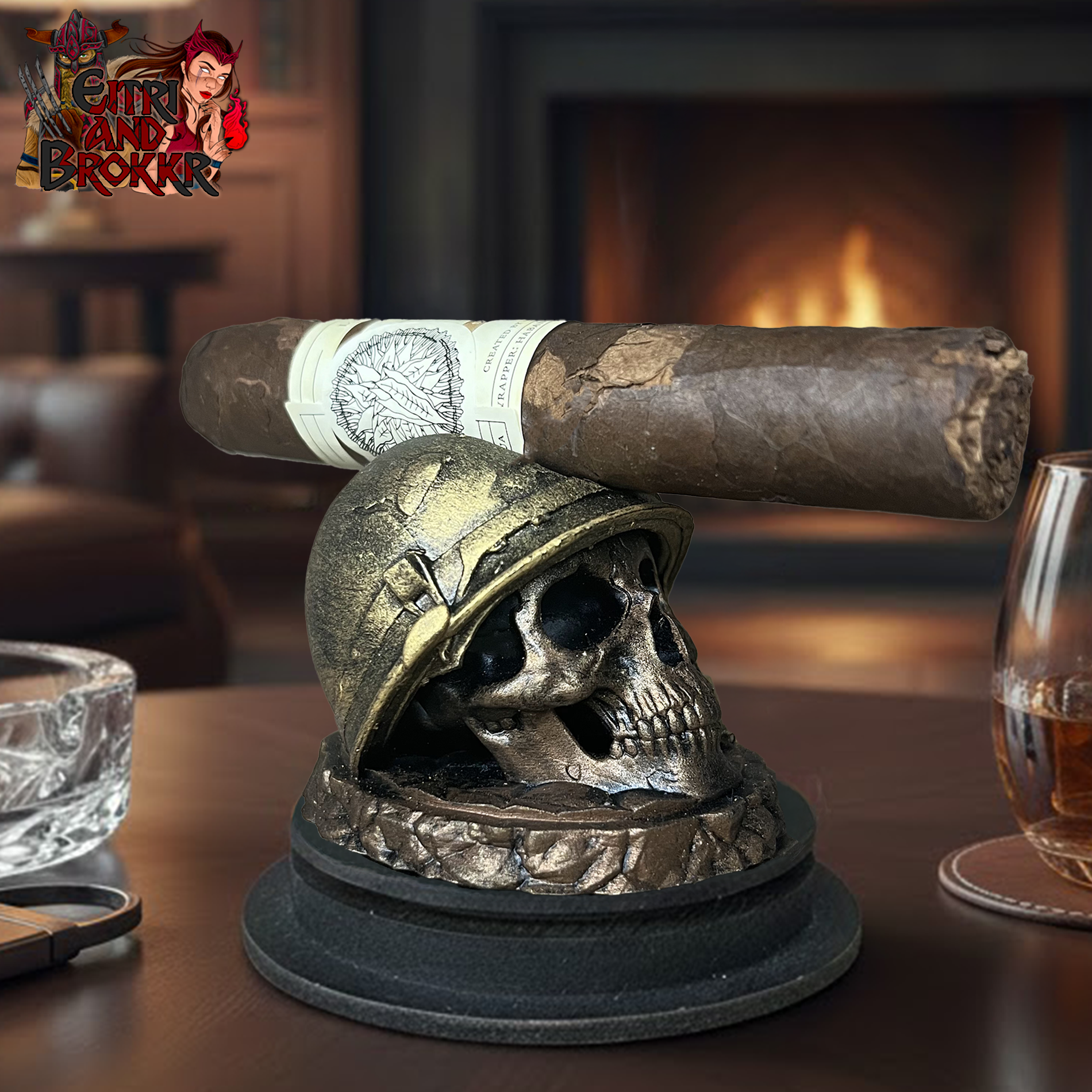 Ce porte-cigare en résine s’inspire de l’esthétique brute et militaire de la Seconde Guerre mondiale. Un crâne marqué par le temps, figé sous un casque de soldat, comme un vestige retrouvé sur un champ de bataille oublié.